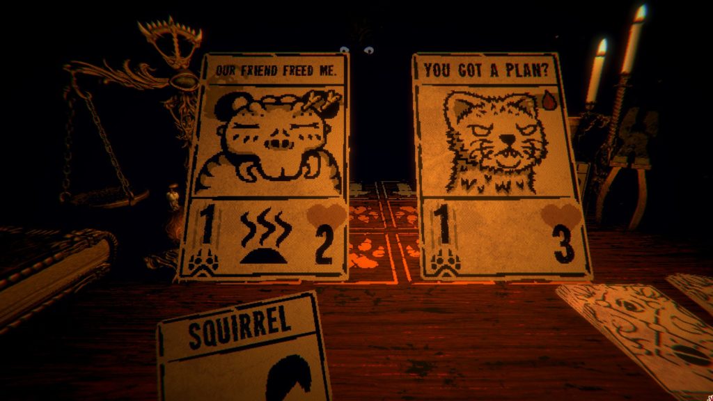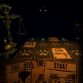 Das klingt für mich bis hierhin wenig interessant. Doch Daniel Mullins wäre nicht Daniel Mullins – der Kopf hinter Pony Island – wenn er dem Prinzip nicht seine eigenen verschrobenen, düsteren Twists verpassen würde. Um eine Karte einzusetzen, muss ich andere opfern. Für den Hermelin muss zum Beispiel ein Eichhörnchen sterben, für den stärkeren Wolf müssen schon zwei Karten dran glauben, für den mächtigen Bären sogar drei. Doch mein schattenhafter Gegner beruhigt mich nach dem ersten Opfer: