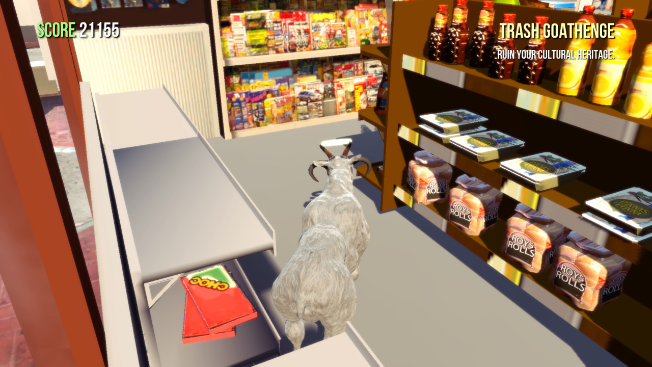 Manchmal darf es auch einfach das Billigprodukt aus der Tanke sein. Goat Simulator hat hierfür das passende Exemplar parat: eingeschweißt in Großverpackungen warten dort in einem Regal helle Brötchen der Marke Roys Rolls auf potentielle Käufer*innen. Eignet sich am besten für schnelle Brunches auf Reisen, bei denen man den Kürzeren gezogen hat und sich morgens vor Tagesanbruch zum Penny in der Nähe begeben muss, um das Frühstück für die noch schlafende Urlaubsbegleitung zu besorgen.