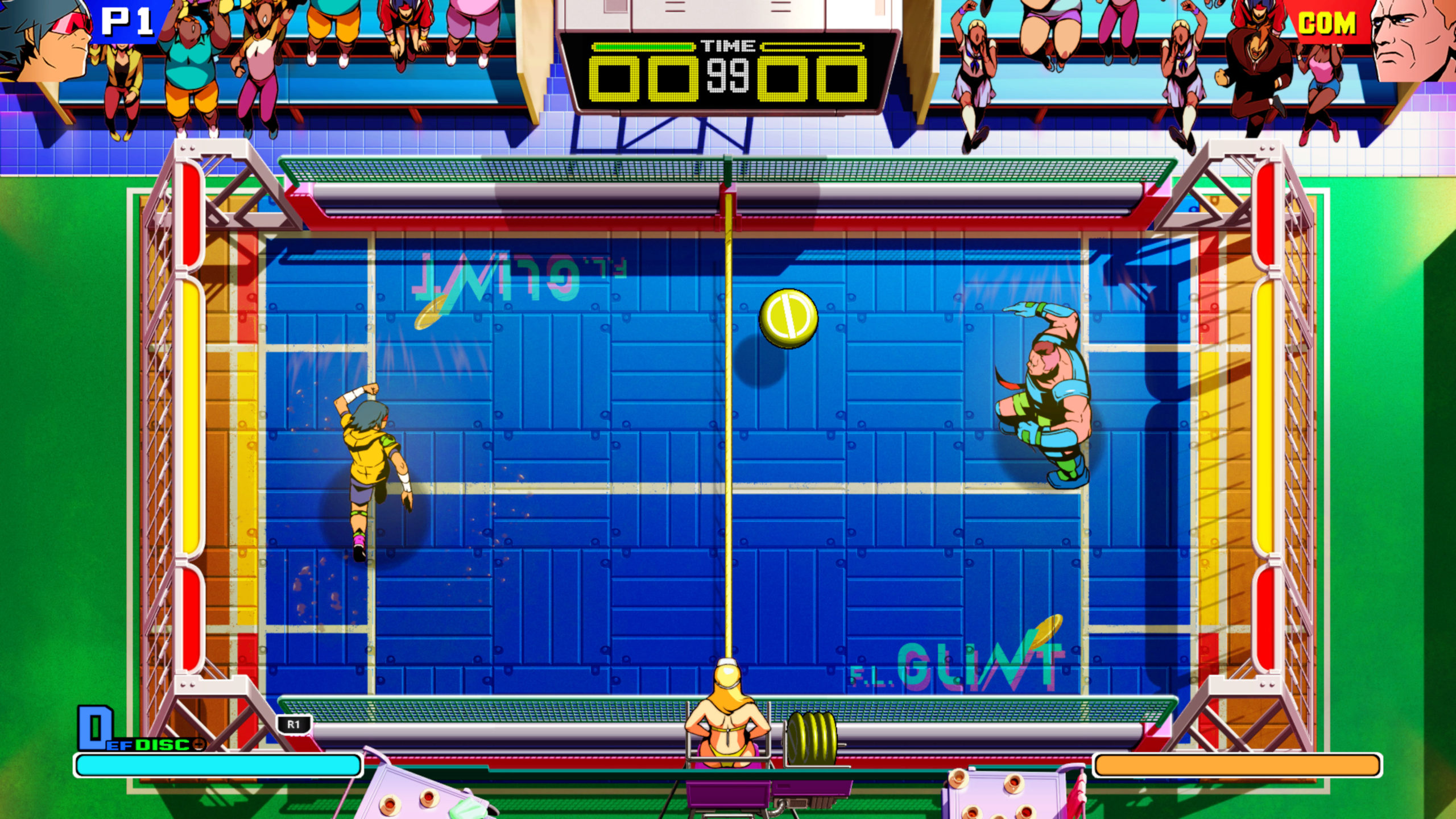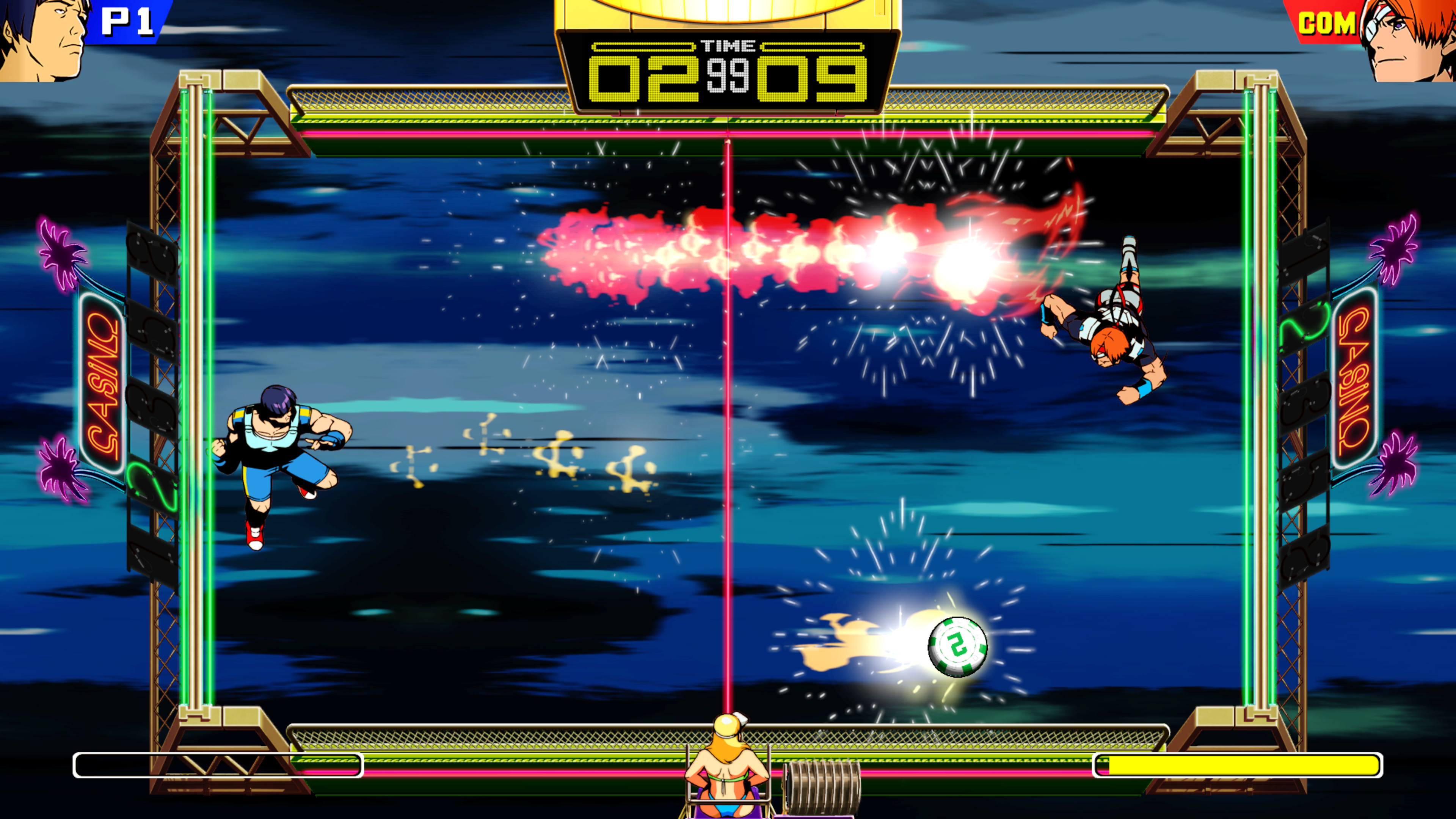 Die Hintergründe sind schrill und arcadig, erinnern mit coolen Animationen an frühe King-of-Fighters-Stages, bieten aber stets genug Ruhe, um den Fokus nicht von der Action abzulenken. Ein paar Felder fahren Gimmicks auf, z. B. Abprall-Hindernisse am Netz oder zufällige ausgewürfelte Punkte auf dem Casino-Court, mir persönlich sind die schlichten Areale aber die liebsten. Die „Gewonnen“- oder „Raketenwurf“-Sprachsamples des deutschen Hünen Klaus Wessel sind kultig, die zwei Mini-Games im Arcade-Modus dagegen recht langweilig und, anders als im 2017er Remaster des Originals, nicht im Menü einzeln anwählbar: DotEmu hat das Hunde-Frisbee-Spiel wiederbelebt, ersetzt das launige Bowling aber durch eine lahme Diskwurfmaschine.