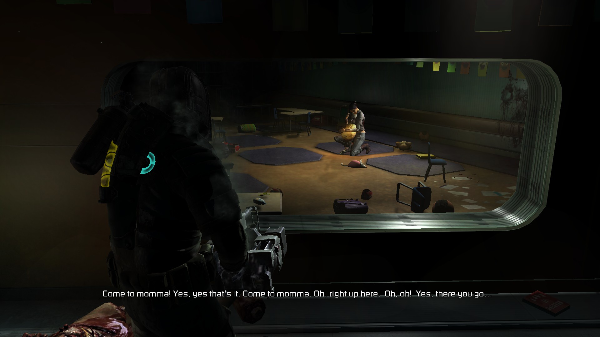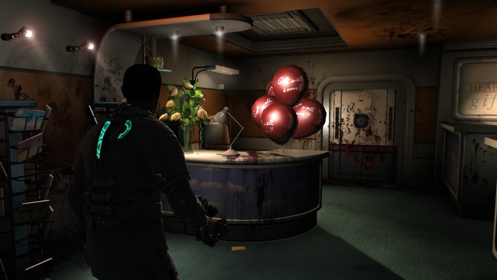 Diese Visionen abzulehnen und nicht als Wahrheit zu erkennen, stellen eine der wichtigsten Herausforderungen für Isaac dar – neben dem Überleben und dem dazugehörigen Absäbeln von Körperteilen der Nekromorphs. Am Ende des Spiels gibt es sogar einen Hoffnungsschimmer, da er sich mit einer realen Frau verbündet – anders als die meisten anderen Menschen, welche bereits vom Marker beeinflusst wurden. Diese geben sich leider dem Wahnsinn gänzlich hin und sterben dadurch, was Isaac als Voyeur miterleben kann. Da wäre der eine Mann, den ihr von hinten dabei beobachten könnt, wie er seinen Kopf immer wieder an die Wand schlägt, bis er daran verstirbt. Eine Frau hingegen spricht hingegen beruhigend auf einen von Maden zerfressenen Leichnam ein. Zuletzt gäbe es da noch die Frau, welche ein Baby zu sich ruft, das sich bereits in einen Nekromorph verwandelt hat und in ihren Armen schließlich explodiert. Richtig harter Tobak.