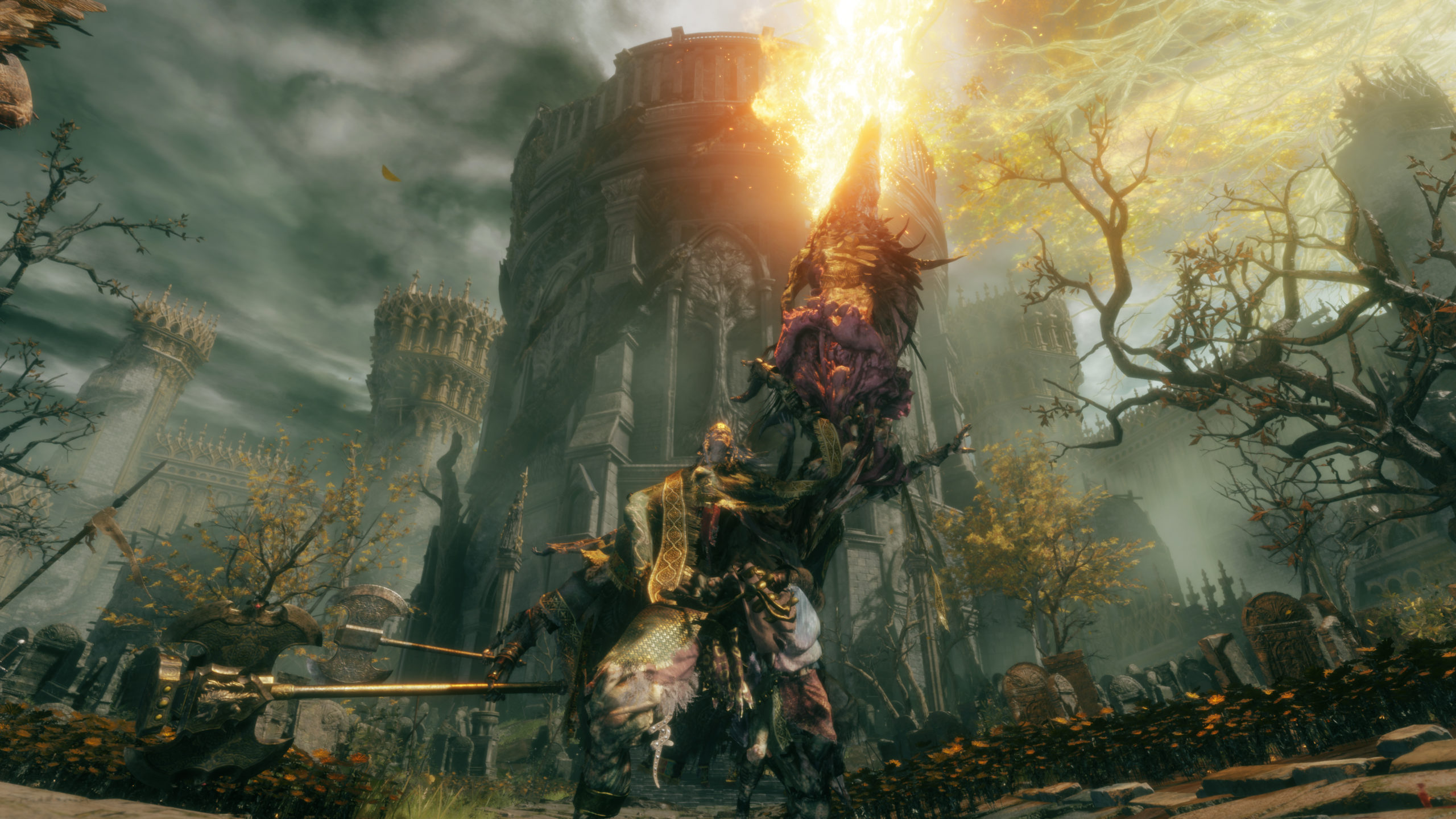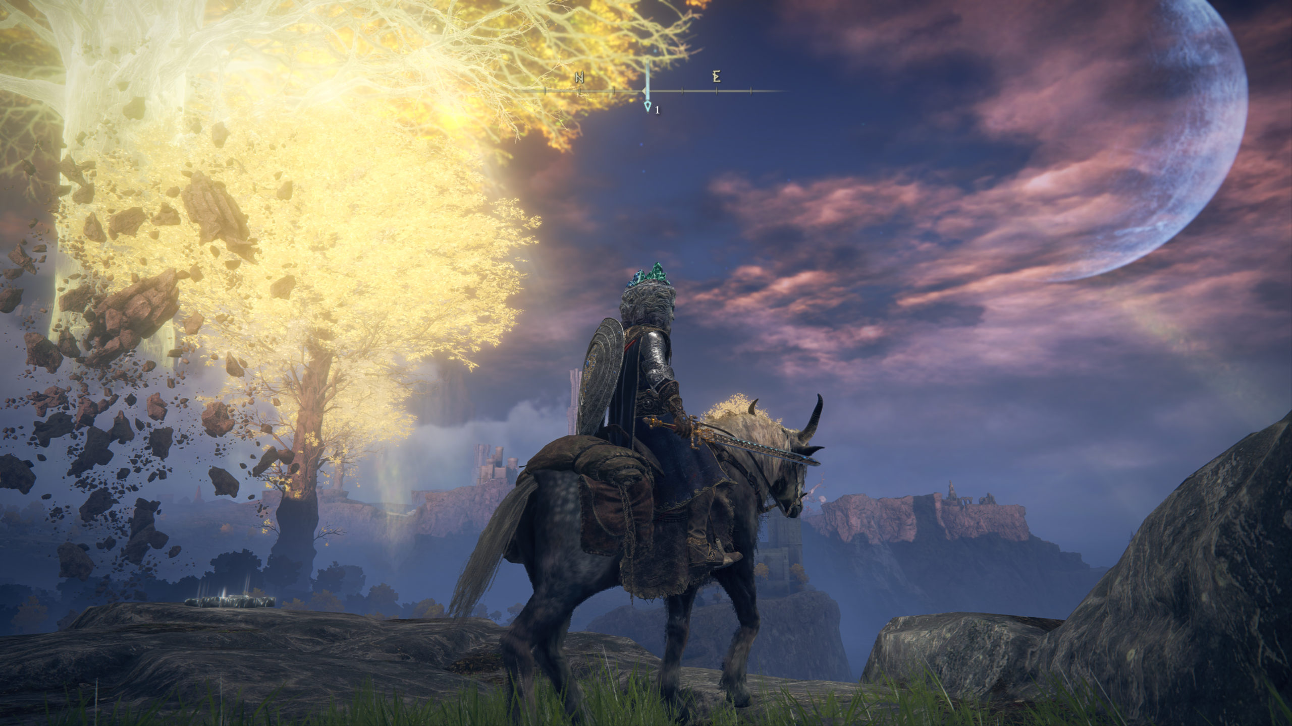 Draußen, vor der Höhle, funkelt es dann magisch. Irgendwie so gar nicht Dark Fantasy. Irgendwie „Breath of the Wild“. Mit dem Blick über die weiten Wiesen und Wälder, die sanften Hügel, die sich zu felsigem Gebirge emporschwingen. Endlose Möglichkeiten. In der Ferne der strahlende Baum. Ich stapfe aber erstmal stumpf den Berg hinauf, so wie man es mir beigebracht hat. Da ist eine Burg. Da muss es weitergehen. Während ich so in die Burg stapfe und Ritter und Fledermäuse erlege, schimpfe ich über Herr Miyazaki. Über seine Einfallslosigkeit, mir schon wieder dieses Spiel zu verkaufen, das ich doch schon so oft gespielt habe.