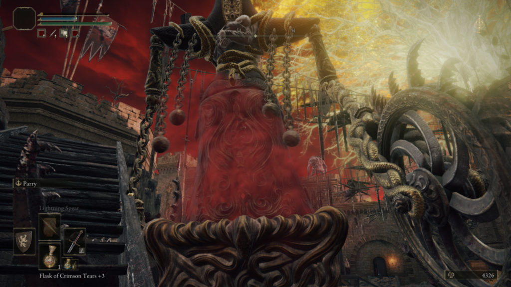 Ich stapfe bis zum ersten Boss, der Margit heißt, wie eine Dame die einen kleinen Gemischtwarenladen führt, der aber dann doch ein riesiger Krieger mit einem Hammer aus Licht ist. Er zerkloppt mich wieder und wieder. Ich werde zurückgespult, bestimmt 15 Mal, bevor ich seine Beats auswendig kenne und ihn mit meinen eigenen Moves zertanze. Kurz nach ihm dann Dance-off mit dem ersten richtigen Boss (er ist größer und schraubt sich midfight einen Drachenkopf an den Arm, der dann Feuer speit…). Nächster Track bitte.