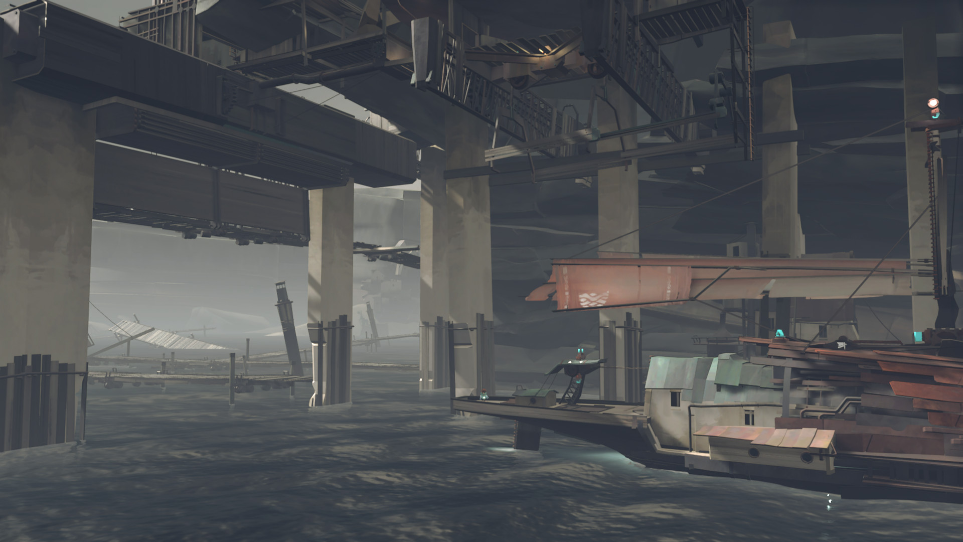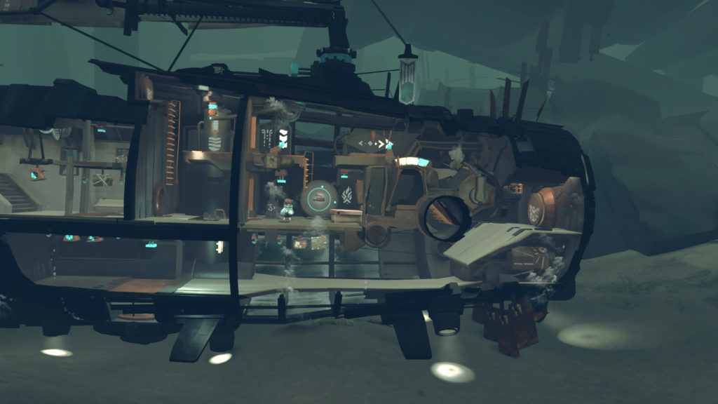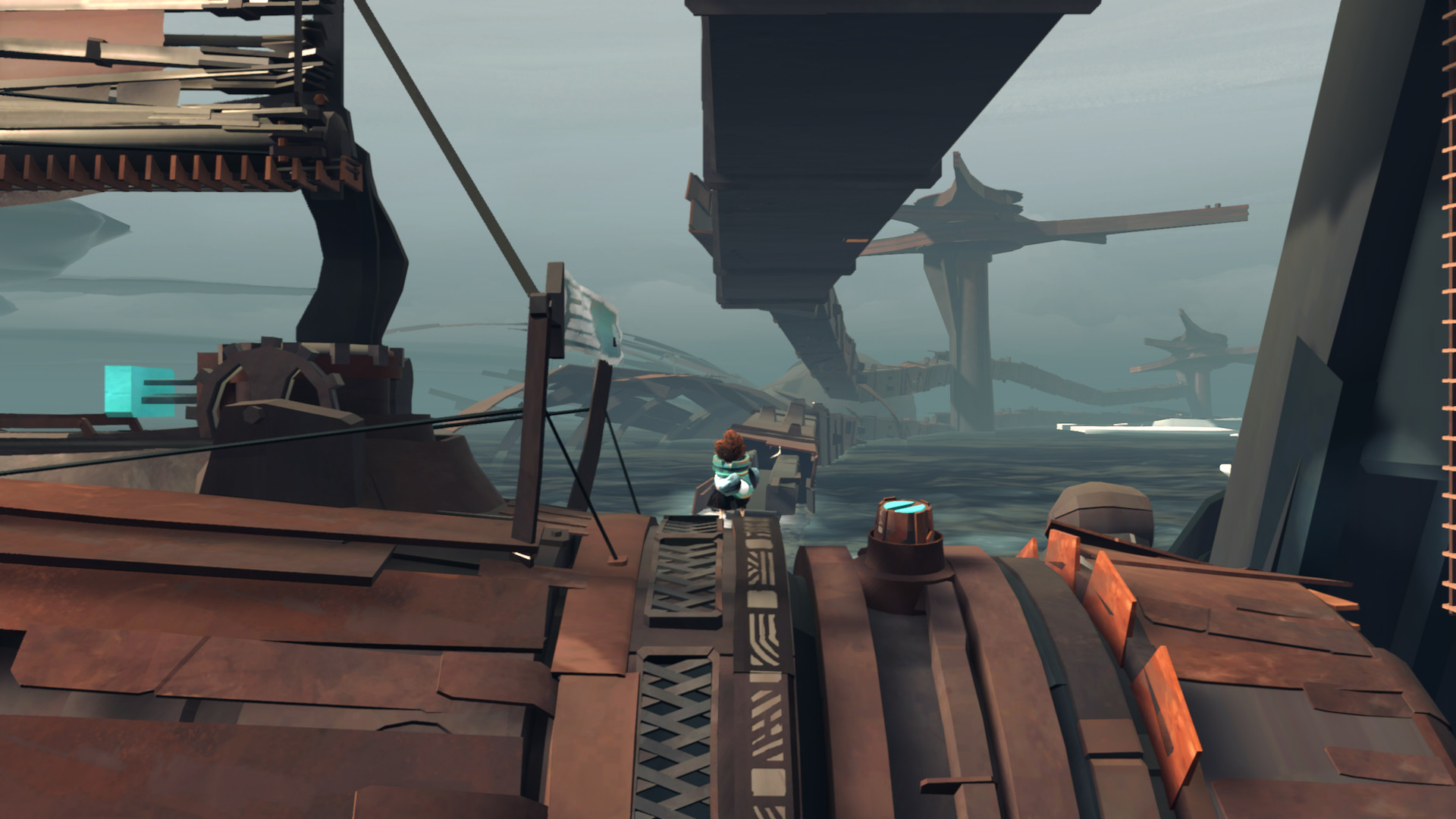 Rein mechanisch gesehen ist FAR eine Art Jump’n’Run. Die winzige Heldenfigur rennt, hüpft und taucht entweder durch ihre Dampfmaschine oder durch andere Ruinen einer industrialisierten Welt. Die Figur hat das unerklärte Ziel, voranzukommen. Dafür entdeckt und bedient sie riesige Loks, Schiffe, Kräne und andere Maschinen. Regelmäßig gehen Dinge kaputt und müssen repariert werden. Die Steuerung ist simpel, es gibt genau einen Knopf zum Hüpfen und einen zum Zupacken oder Bedienen. Hier geht es nicht um echte Hürden, eher um etwas Reibung, damit sich die Reise interaktiv anfühlt. Auch die Rätsel lösen sich durch hartnäckiges Schauen und Knopfdrücken wie von allein.