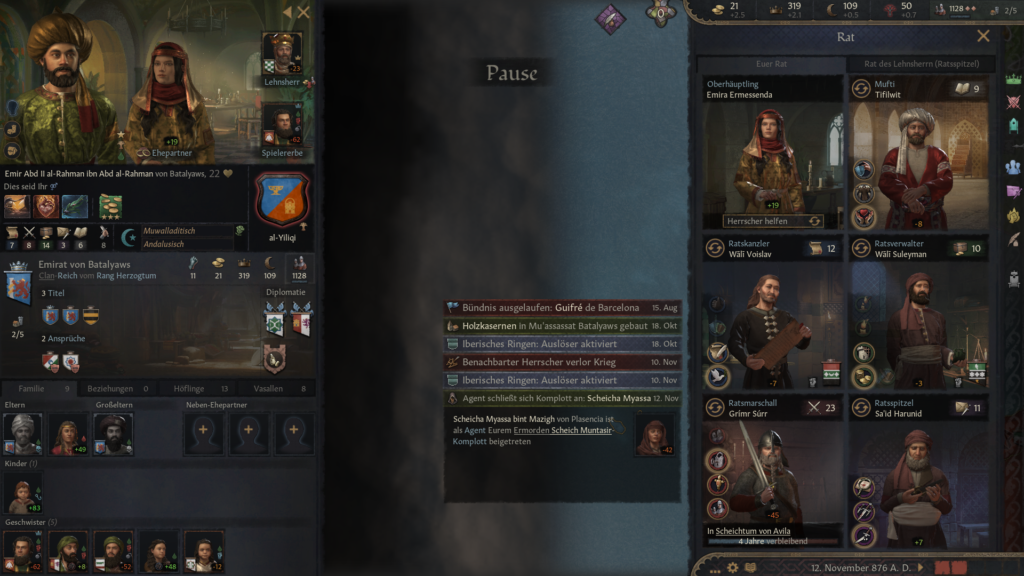 Aber jetzt gehört sie einem meiner Söhne, von denen ich fünf habe. FÜNF – das ist ein echtes Problem! Wahrscheinlich ist das auch der Grund für mein Ableben, denn ich bin unter höchst unklaren Umständen bei einem Überfall im Wald ums Leben gekommen. Kann sein, dass das einfach nur ein Überfall war; kann sein, dass die Umayyaden einen Vasallen, der zu mächtig wurde, loswerden wollten. Aber wenn ich wetten müsste, wer mir zum Verhängnis wurde, würde ich auf einen meiner fünf Söhne setzen, der es nicht erwarten konnte, an die Macht zu gelangen. Jetzt besitzt auf jeden Fall jeder von diesen machtgierigen Hunden sein eigenes Scheichtum – der Bürgerkrieg in meinem Emirat ist praktisch vorprogrammiert. Dass ich jetzt den ältesten Sohn spiele, der ganz nebenbei womöglich meine vorherige Spielfigur ermordet hat, hilft mir nicht, denn ich habe kaum Truppen und meine Brüder haben sich gegen mich verbündet. Der Traum von der Herrschaft über al-Andalus ist in weite Ferne gerückt.