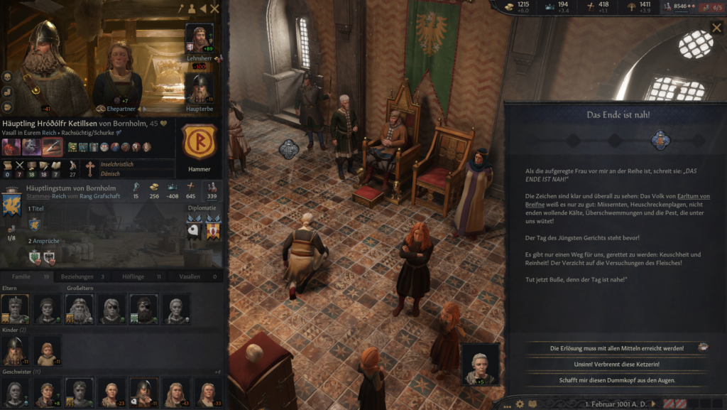 Trotzdem gibt es natürlich die großen Strukturen, die ein Zeitalter und seine Gesellschaften definieren. Für das Mittelalter ist neben der Religion das Feudalsystem die prägendste gesellschaftliche Struktur. Und so wird Crusader Kings zu Recht auch als Simulation des Feudalsystems bezeichnet. Für Spieler*innen bedeutet das eine erhebliche Umstellung. In praktisch allen anderen historischen Aufbaustrategie-Spielen spielt man in letzter Konsequenz Staaten, die versuchen ihr Staatsgebiet und ihren Reichtum zu mehren. Das ist auch in Crusader Kings nicht völlig unwichtig, aber letztlich zweitrangig. Hier geht es vor allem um eines: die Familie! Staaten gibt es in Crusader Kings im Grunde nicht, sondern Familien, denen andere Familien als Vasallen zur Gefolgschaft verpflichtet sind. Macht hat derjenige, dessen Familie die meisten Vasallen hat. Stirbt der Spielcharakter, spielt man mit dem ersten Erben des Spielcharakters weiter. Verliert man sein Königreich, spielt man eben mit einem seiner Herzogtitel weiter. Das Spiel endet erst, wenn man entweder keinen Titel oder keinen Erben mehr hat.