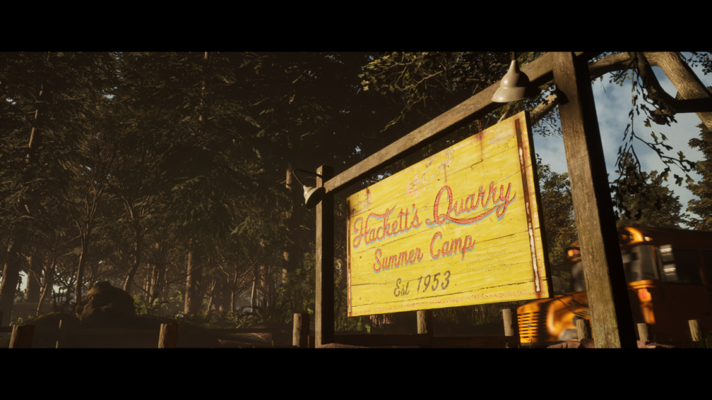 Was das Szenario angeht, stapelt „The Quarry“ etwas tiefer als die genannte Reihe. Gesellschaftlich Relevantes, wie das Verhalten in bewaffneten Konflikten oder der Umgang mit psychischen Erkrankungen, wird hier nicht gestreift. Wie bei seinem Vorgänger, handelt es sich vielmehr um eine spielbare Hommage an das Teen-Slasher-Genre. Statt in das winterliche „Blackwood Pines“ auf Mount Washington im US-Bundesstaat New Hampshire, geht es dieses Mal ins sommerliche „Hackett’s Quarry“-Camp in Upstate New York. Dort gibt es dichte Wälder, einen malerischen See, und ganz viel Lagerfeuerromantik. Nur das Motto des Camps sollte allerdings nicht nur uns als eingeweihte Spielerinnen stutzig machen: „Was dich nicht umbringt, macht dich nur stärker.“ Klingt spaßig.