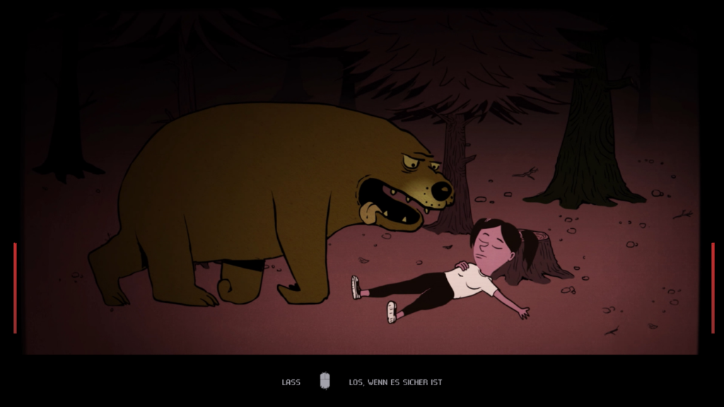 Darin gilt es, per Knopfdruck oder Mausklick solange die Luft anzuhalten, bis sich die Bedrohung, vor der man sich versteckt, weit genug entfernt hat. Das Tutorial macht aber nicht klar, ob die Gefahr gänzlich verschwindet, sobald sie einmal außer Sichtweite ist – oder womöglich sofort wiederkehrt. Verstanden hat das bis kurz vor Schluss niemand von uns.