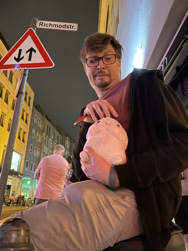 Der werdende Plüschpenis-Papa zückte sein Smartphone. „Schwester, ist es egal, was für ein Plüschtier es ist?“ – „Ja, Hauptsache keinen Schlüsselanhänger.“ Geldbeutel gezückt, ein Exemplar ausgesucht und da war sie, die passende Entlohnung für die Autoleihe. Weil der Messetag noch nicht ganz vorüber war und es sich als überraschend anstrengend erwies, einen über einen Meter großen Kuschelpenis per Hand durch die Kölnmesse zu tragen, klemmte der heimliche Held die Errungenschaft an seinen Rucksack.