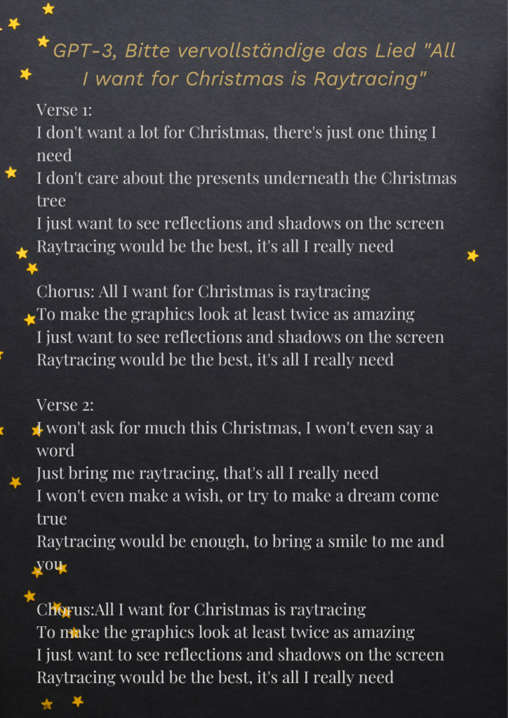 Dieses Duett verfasste Nicolas unter Zuhilfenahme eines Gesprächs mit dem Chatbot ChatGPT. Dabei stammen 50% der Zeilen von Nicolas und 50% von der AI. Doch wo Nicolas aufhört und wo AI beginnt, konnte bis zur Veröffentlichung dieses Türchens leider nicht abschließend geklärt werden. Schade?