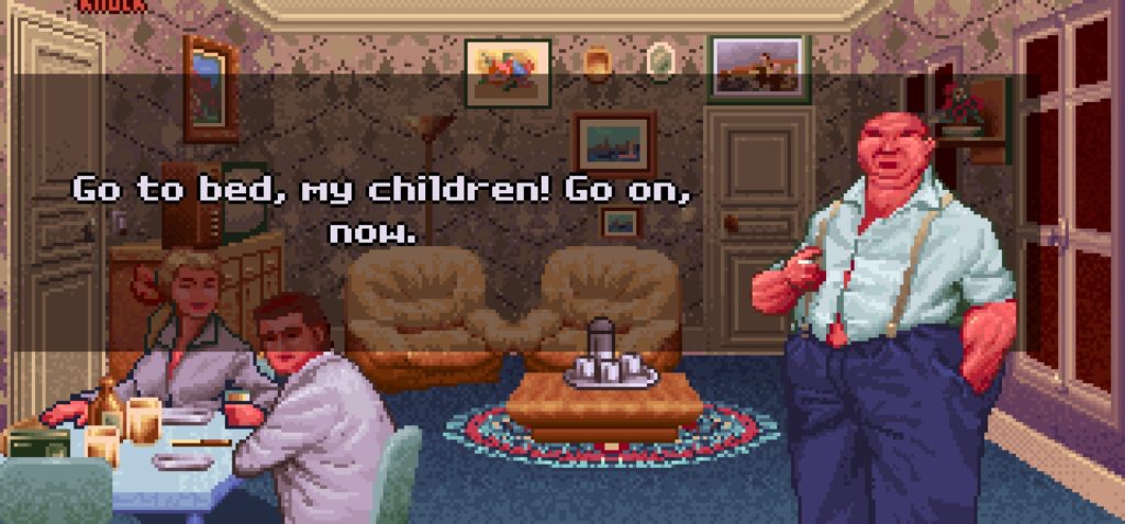 Bis zu dem Moment, als Rukov K.O. geschlagen wird und in einem schäbigen Hinterzimmer wieder aufwacht. Es ist Mitternacht. Rukovs Schnüffelei ist der örtlichen Bande aufgefallen, für den nächsten Morgen wird ihm seine Hinrichtung angekündigt. Die Tür öffnet sich, ein Ami in Jeansmontur wird hineingeworfen. Er stellt sich als Mickey Duck vor, Rukov als Josef Stalin. Das Gespräch versandet. Es wäre jetzt gut, gemeinsam einen Ausbruchsplan auszuhecken, aber Rukov hat andere Sorgen: Seine Blase ist wieder voll. Kühl kündigt das Spiel mir an, dass Rukov jetzt mal müsste. Aber was soll ich machen, der Raum ist kahl und klolos, kein menschenwürdiges Behältnis in Sicht. Die Minuten ticken vorbei, bis das Spiel mit dem digitalen Äquivalent eines Schulterzuckens meldet, dass die Schleusen wieder geöffnet sind, der Brunnen läuft, unser KGB-Agent tut, was getan werden musste. Nur dass dieses Mal noch ein weiteres Textfenster folgt: „Der Mann in der Jeansjacke tut so, als habe er deinen kleinen Unfall nicht bemerkt.“