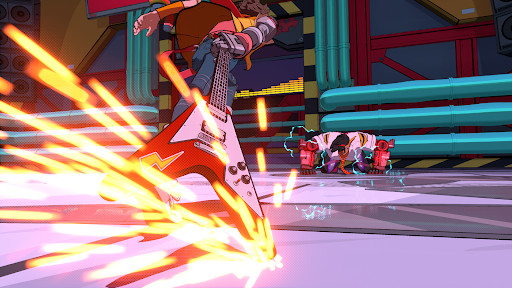 Twang. Pling. Pling. Brrrring. Kerrang. Ein Doppelsprung mit A. Der Magnethaken auf LB katapultiert mich durch die Arena. Der Rhythmus pusht mich weiter nach vorne. Zweimal X, dreimal Y. Immer auf den Beat. Die Gitarre in meinen Händen drischt auf die Gegner ein, pulverisiert alles mit einem Kreischen aus dem Verstärker. Die Combo hat gesessen. Jeder Hieb ein Akkord. Ausweichen mit RB. Die Spielwelt von „Hi-Fi Rush“ vibriert im Takt des Songs. Bass und Drums und blinkende Lichter lassen meinen Körper auf dem Sofa wippen. Mit einem Klick auf beide Analogsticks aktiviere ich den Finisher, rutsche mit angelegter Gitarre auf die Robotergegner zu und shreddere alles in Grund und Boden. Was für ein Solo.